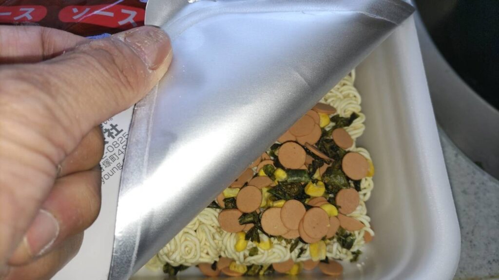 外装を剥がし、蓋を半分まで開けて「かやく」を投入します。